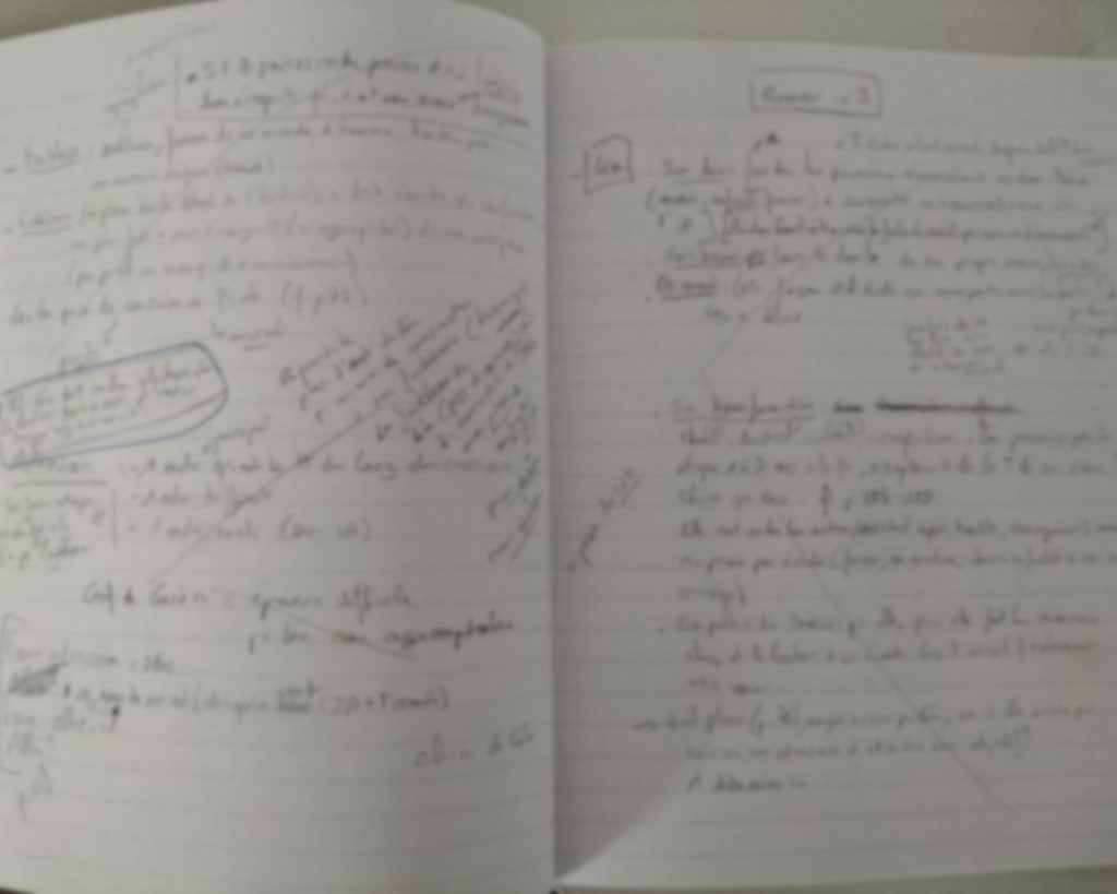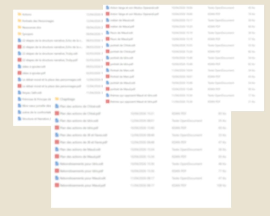 Tout ça avec un carnet d’abord. Puis un gros cahier quand le carnet ne suffisait plus. Puis un traitement de texte quand le flux d’idées est devenu trop dense pour le papier. J’ai ensuite compilé et produit un synopsis détaillé. Puis des plans d’action pour chaque personnage. Puis j’ai tout rassemblé sur Notion pour organiser les chapitres en ayant tout sous les yeux en même temps.